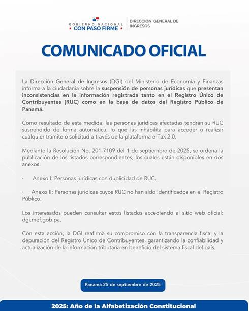 La Dirección General de Ingresos (DGI) de Panamá informó la suspensión automática de personas jurídicas que presentan inconsistencias entre el Registro Único de Contribuyentes (RUC) y la base del Registro Público. Esta acción busca depurar y fortalecer la fiabilidad del padrón tributario.