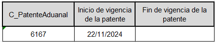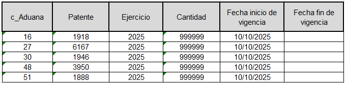 La actualización incluye nuevas combinaciones de aduana, patente y ejercicio, así como una patente adicional activa a partir del 3 de octubre de 2025.