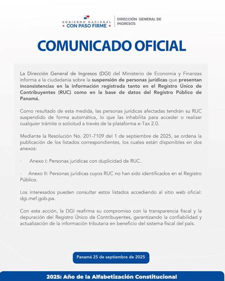 Esta acción, amparada en la Resolución No. 201-7109 del 1 de septiembre de 2025, busca depurar el padrón tributario y garantizar la integridad de la base de datos fiscal.