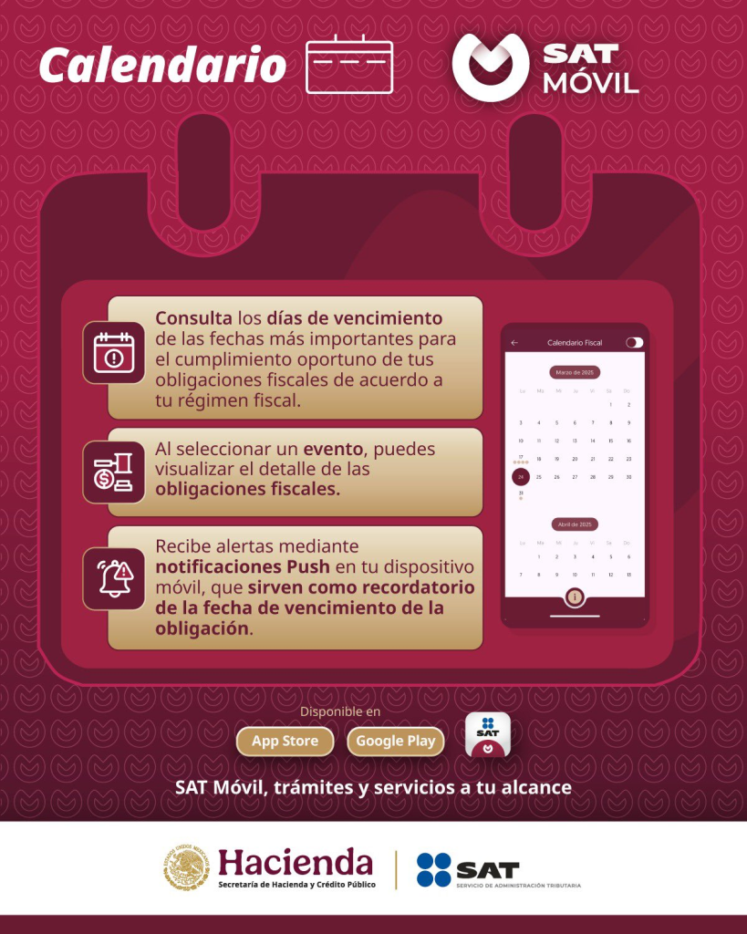 El Servicio de Administración Tributaria (SAT) promueve el uso de la aplicación SAT Móvil, que permite consultar las fechas de vencimiento de las obligaciones fiscales según el régimen de cada contribuyente.