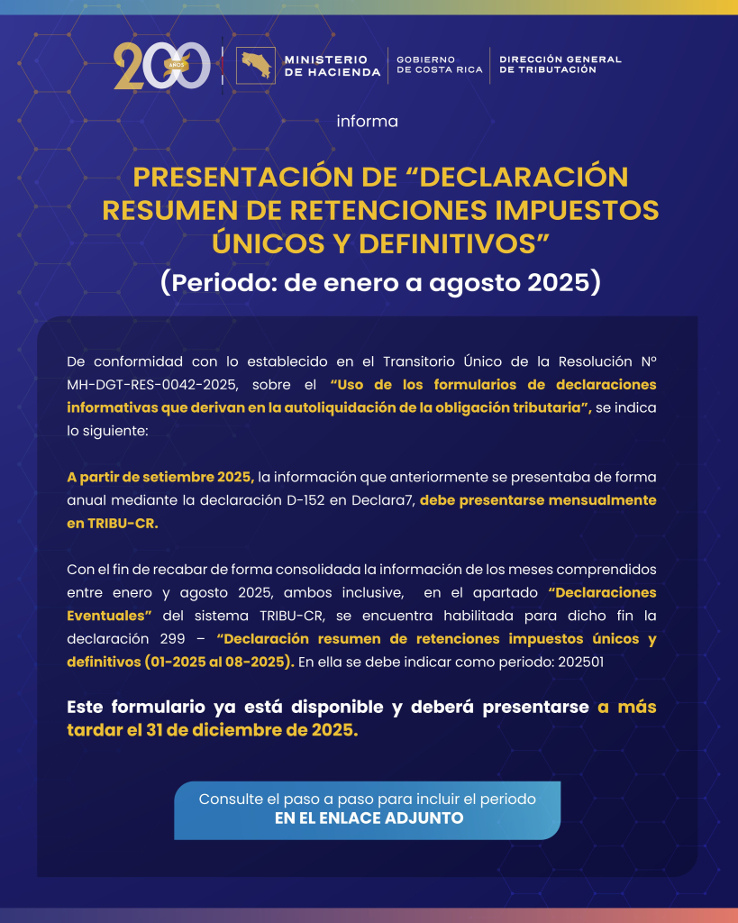 El Ministerio de Hacienda de Costa Rica, a través de la Dirección General de Tributación, informó sobre la habilitación del formulario 299 – “Declaración resumen de retenciones impuestos únicos y definitivos”, aplicable al período enero a agosto 2025.